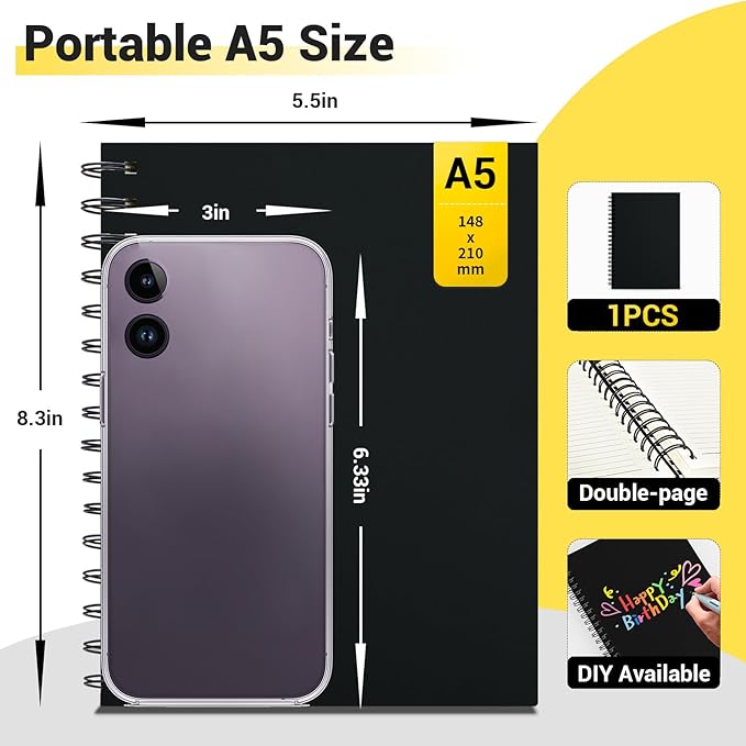 EUSOAR Black Spiral Notebook, 1 Pack A5 5.5"x8.3" Hardcover College Ruled Lined Journal, 240 Pages(120 Sheets) Writing Pads Professional Notebook for DIY Note Taking School Business Work Office Diary