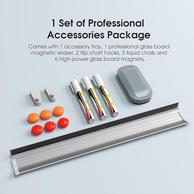 - 15-Minute Fast Installation with Complete Professional Accessories: Comes with an installation template, accessory tray, premium magnetic glass board eraser, 3 markers, and 6 strong glass board magnets; easy setup within 15 minutes for horizontal or vertical mounting