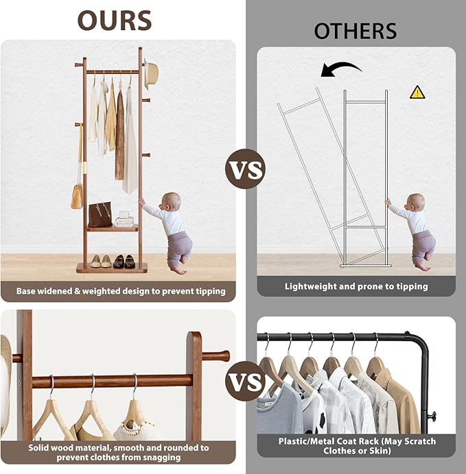 - 【Solid Wood & Heavy Duty Construction】 Made of 100% solid wood with double-layer shelves, this coat rack ensures superior stability and long-lasting durability. The reinforced structure supports heavy coats, bags, and accessories without wobbling