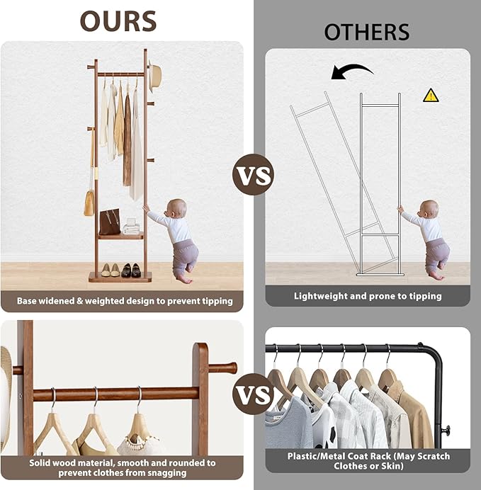 - 【Solid Wood & Heavy Duty Construction】 Made of 100% solid wood with double-layer shelves, this coat rack ensures superior stability and long-lasting durability. The reinforced structure supports heavy coats, bags, and accessories without wobbling