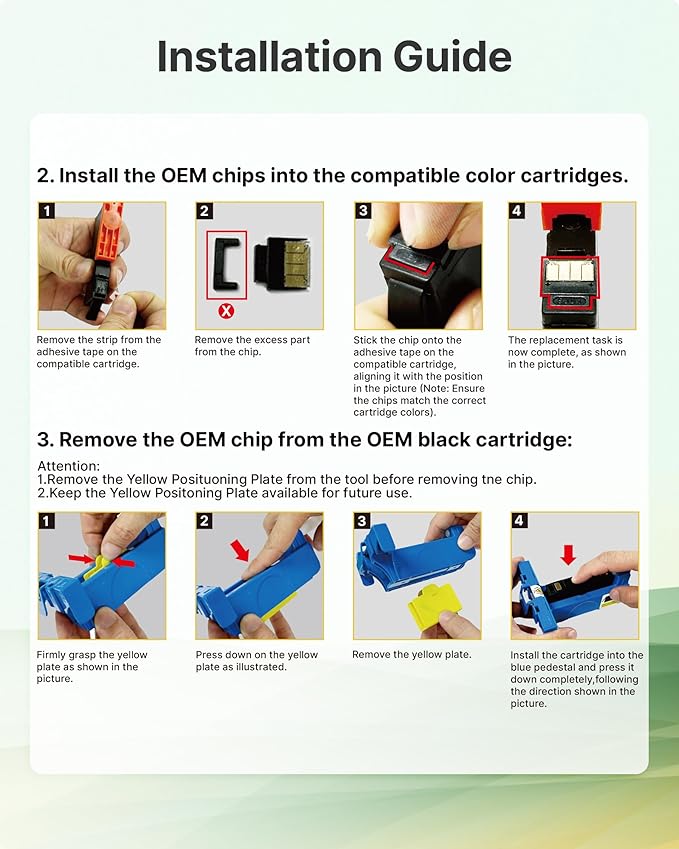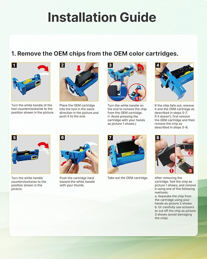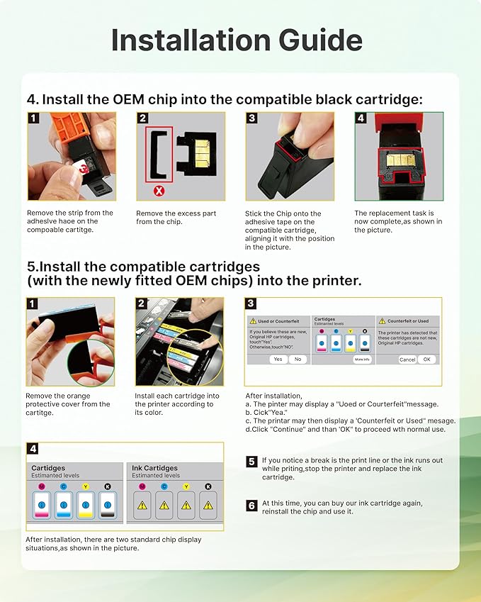 - ๐๐จ๐ญ๐ข๐๐๏ผ๐๐จ ๐๐ก๐ข๐ฉ: Please check if you have the OEM 923 ink cartridges for hp printers before order and follow the Installation Guide to swtich the oem chip on Our 923 for HP ink cartridge to help it work well on your printer.