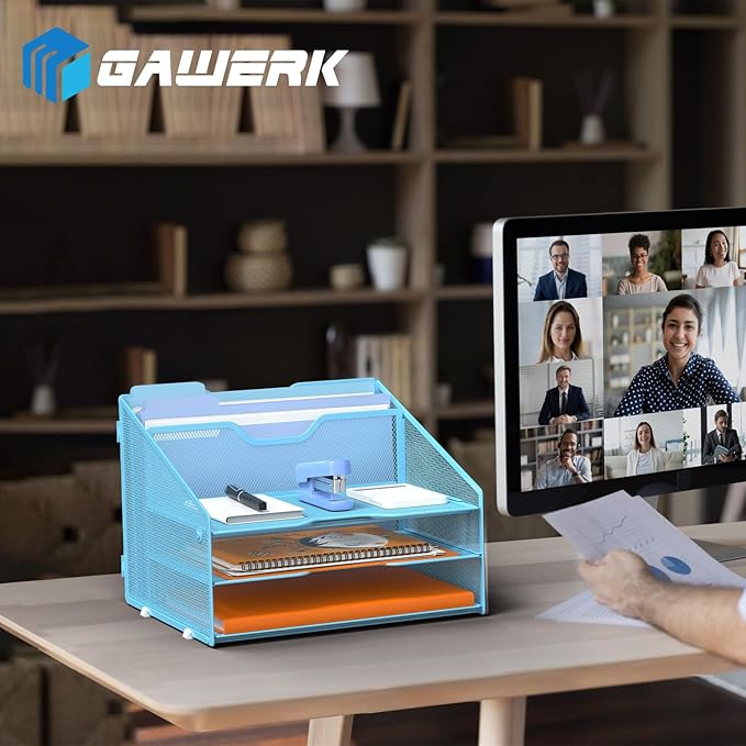 Letter Tray Organizer, Mesh Desk File Organizer with 3 Paper Trays and 2 Vertical Upright Section (Blue)