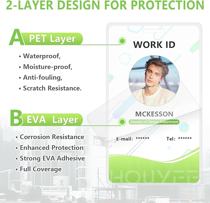 - 【5 Mil & Sturdy Material】:These ID badge laminating pouches are made from premium materials,5 Mil Thickness,sturdy,capable of withstanding high temperatures,They effectively protect your ID card from bends and surface moisture.