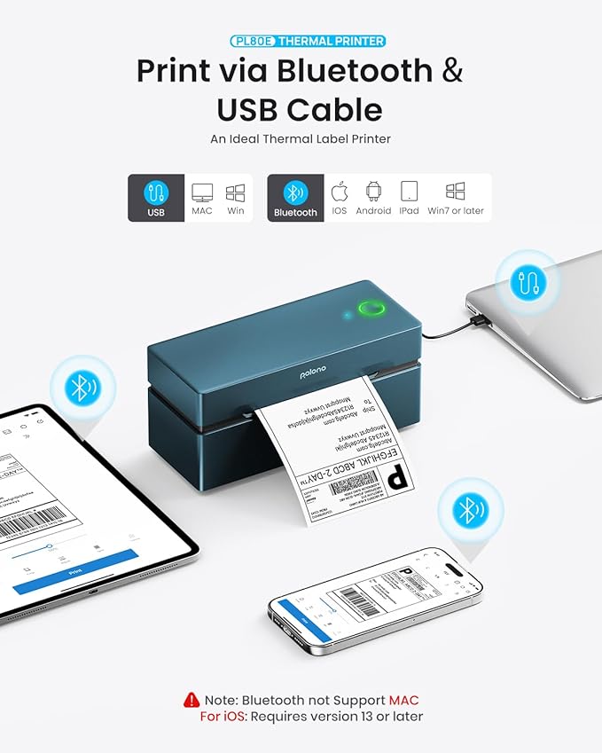 - Printing via Bluetooth: The thermal printer supports Bluetooth printing via the "Labelnize" app. Download the app from Google Play or Apple App Store for Android and iOS 13 or above. For Windows 7+, connect the shipping label printer via Bluetooth, please successfully install the driver via USB before using the Bluetooth connection. Always connect the thermal printer through the app; do not connect the shipping label printer directly via Bluetooth. Note: MAC OS does not support Bluetooth connection for the thermal printer