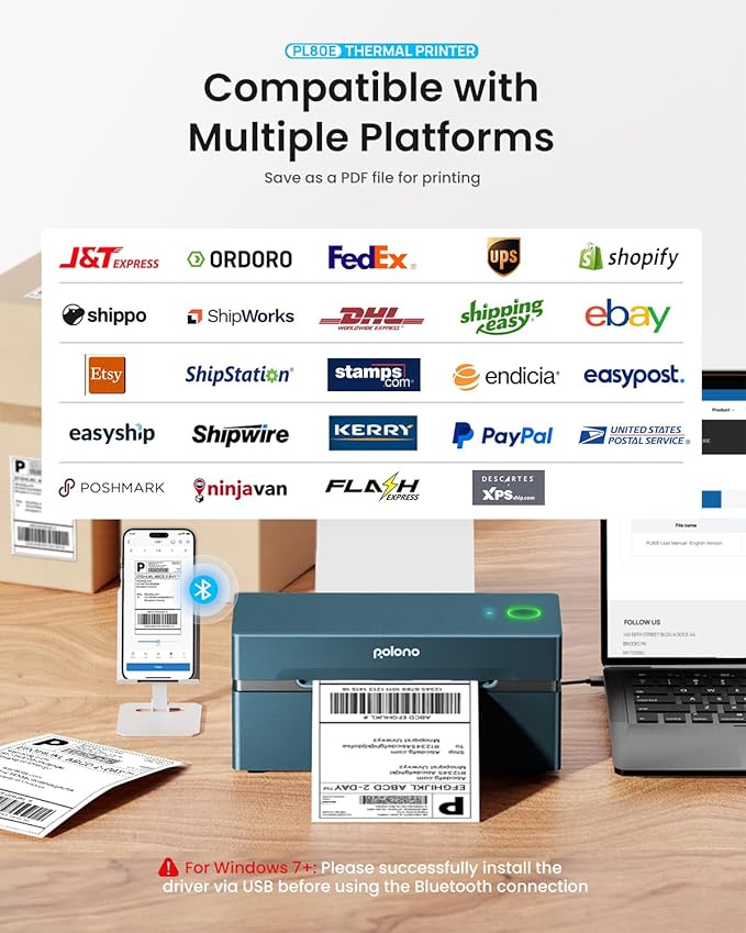 - Printing via USB: For both Windows and Mac, you can connect the shipping label printer using a USB cable. This thermal printer is easy to set up and use, ideal for small businesses. Wide Compatibility 4x6 inch Thermal Printer for Shipping Packages. You can refer to the operation video and manual to set it up. Note: PL80E shipping label printer doesn't support Chrome OS