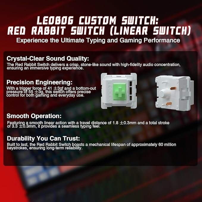 - Fully Hot-Swappable Design: Swap switches and keycaps effortlessly β no tools or soldering needed. Comes with a switch puller and keycap puller for easy customization, and works with both 3-pin and 5-pin switches. Factory-lubed linear switches deliver smooth, consistent keystrokes and crisp, satisfying sound, making every press fast, responsive, and enjoyable β ideal for gamers and typists who love tactile feedback and audible clicks