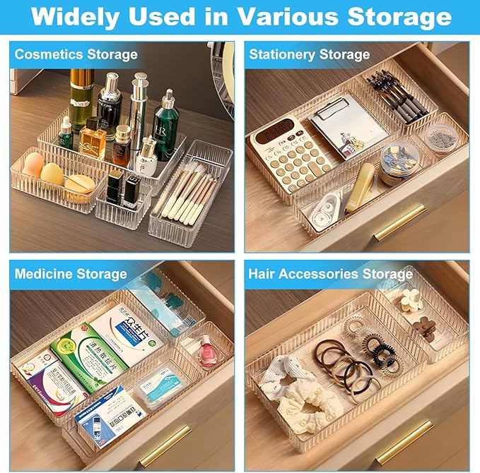 - Versatile Storage Options: Our plastic drawer organizers are suitable for various drawer sizes and areas, including vanity, bathroom, kitchen, and office drawers. The clear design allows for quick organization and easy retrieval of items, keeping your space neat and tidy.