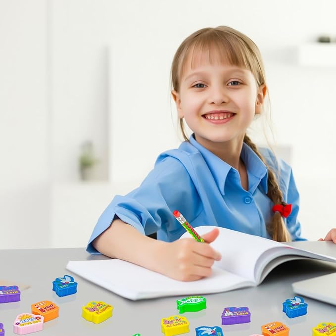 - Bright Colors & Kid-Friendly Designs:Featuring a mix of bright colors and faith-themed illustrations like crosses, hearts, and doves, these erasers are visually appealing and great for motivating children to enjoy learning
