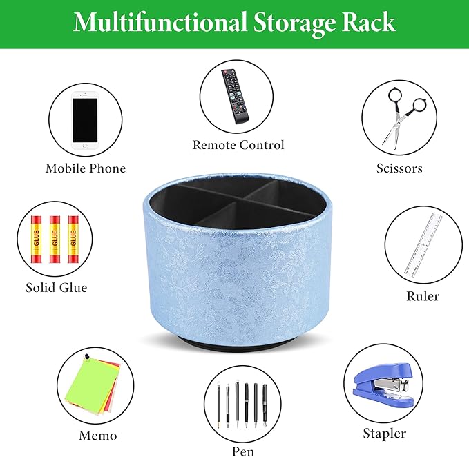 lizimandu Round Leather Art Supply Organizer,Remote Control Holder,360 Degree Spinning,Multi-Functional Pencil Holder,4 Compartments Desktop Stationary Organizer(1-Liuli Blue)