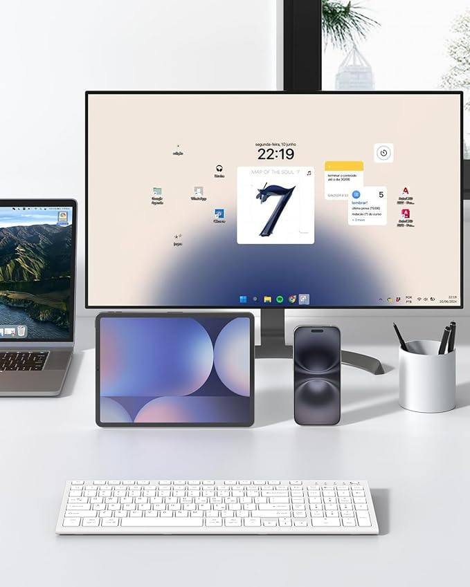 - Special Feature : 3 Bluetooth + 2.4G USB for multi devices, Compact full-size 121 keys 10% shorter, Ergonomic Silent Slim, Silent, Slim 3 Bluetooth + 2.4G USB for multi devices, Compact full-size 121 keys 10% shorter, Ergonomic Silent Slim, Silent, Slim