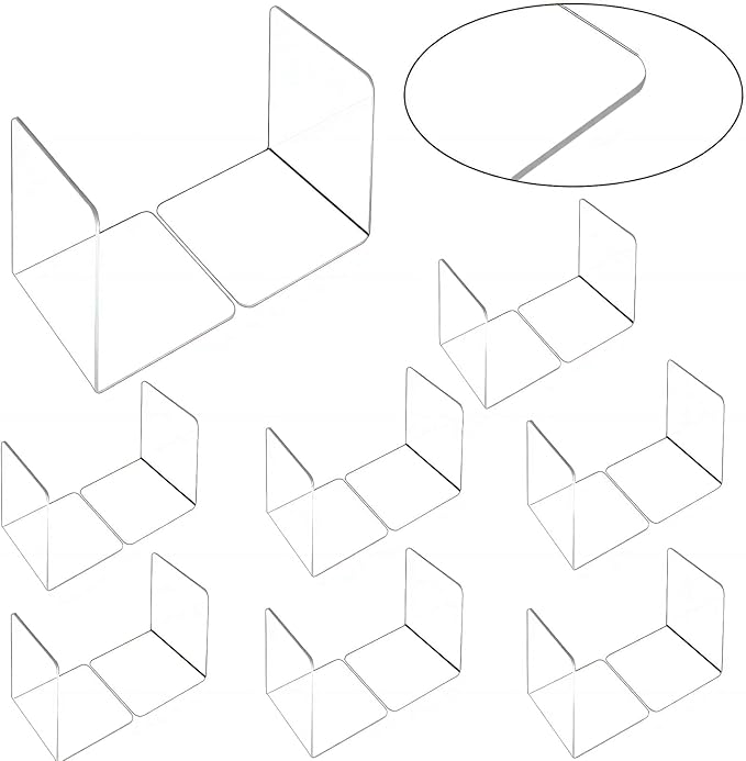 - Stable, Smooth and Flat: with a simple L shaped design, these clear book ends are structurally stable, so that the books are vertically aligned and well balanced; Made of quality acrylic, they are strong and safe, smooth and flat, with rounded corners without pointed burrs, and can be applied with confidence; Tear off the frosted film and it is a clear acrylic bookend