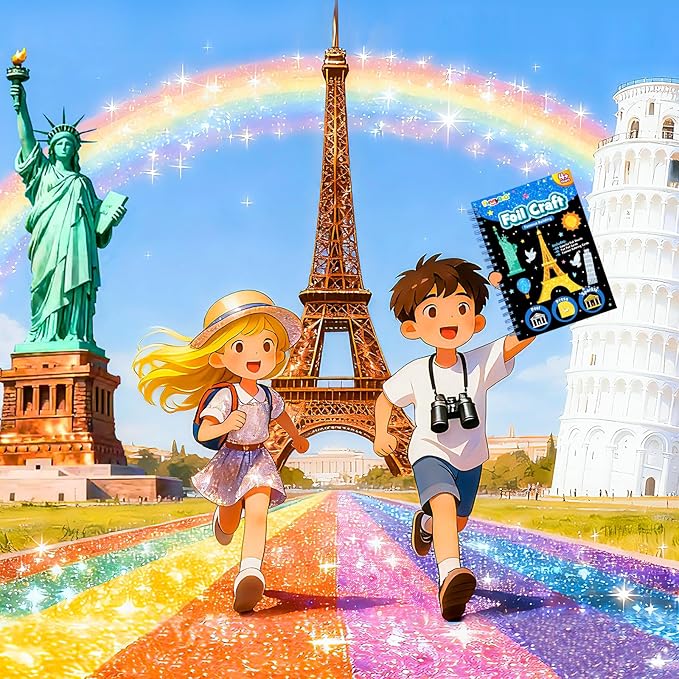 - 👸Easy-to-Use Foil Art Craft Kit : This foil art crafts kit includes 80 colored foil paper, 16 foil cards, one 8--color crayon and 16 coloring cards– an ideal filler for toddlers & kids! No glue, no mess, just peel & press to create: Eiffel Tower,Statue of Liberty,Sydney Opera House,Pyramids of Giza,Tower Bridge,Red Square,The White House and more interesting world-famous buildings designs.Let Kids know and observe the world by learning about famous buildings,Keep boys and girls engaged during crafts and classroom creative activities or travel kids activity