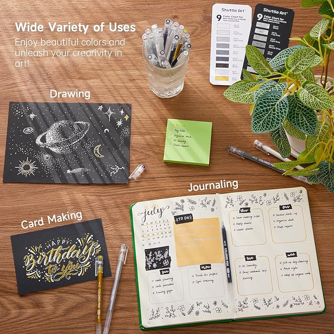 - 22 BLACK WHITE GRAY & METALLIC TONES & 2 COLOR SHEETS: Shuttle Art colored pen set comes with 4 Black, 4 White, 2 Silver, 2 Gold and 8 Gray Tone Pens. Vibrant colors look stunning on paper, especially standing out on black paper. Additionally, it contains 2 bonus color sheets. A hassle-free choice for your creating.