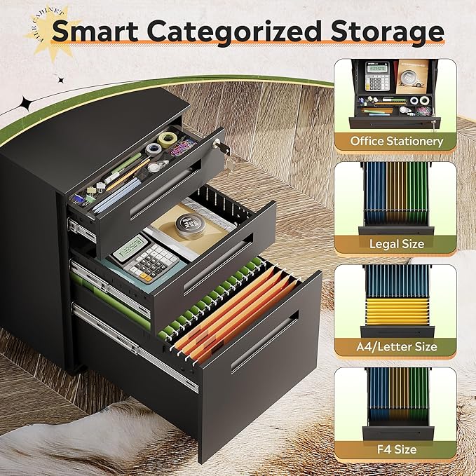 - đď¸ăEfficient Categorized StorageăThis 3-drawer filing cabinet includes two upper drawers with an adjustable tray for small supplies, and a deep bottom drawer that fits A4, F4, Letter, and Legal hanging filesâkeeping everything neatly sorted and within reach.
