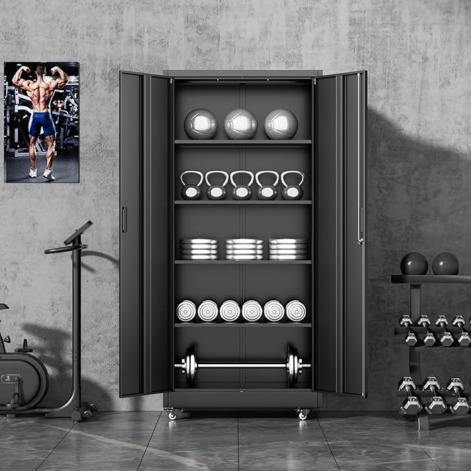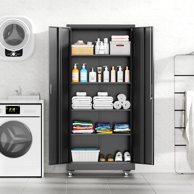 - ✅【EASY TO MOVE】Our garage storage cabinet has four lockable wheels that can be rotated 360 degrees, You can easily move it anywhere you want without worrying about being out of control. (adjust up to move, adjust down to lock)