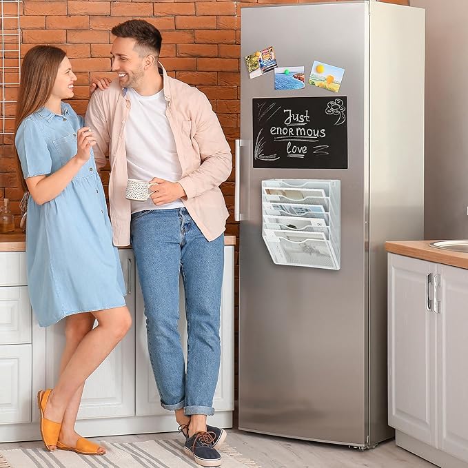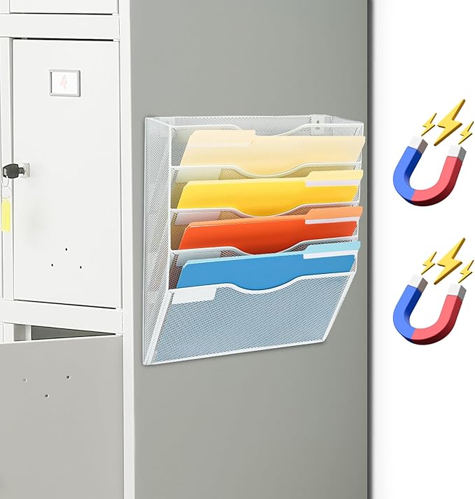 EASEPRES Magnetic 5 Pocket Mesh Hanging File Organizer, Wall Mounted Mail Paper Document Folder Holder, Clipboard Storage Organization Magazine Rack with Nametag Label for Office Home School, White