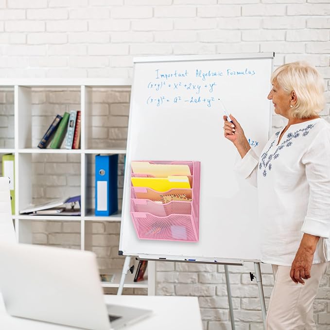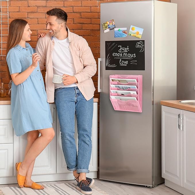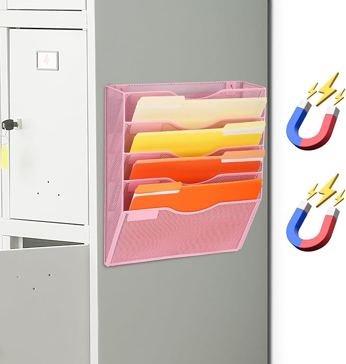 EASEPRES Magnetic 5 Pocket Mesh Hanging File Organizer, Wall Mounted Mail Paper Document Folder Holder, Clipboard Storage Organization Magazine Rack with Nametag Label for Office Home School, Pink