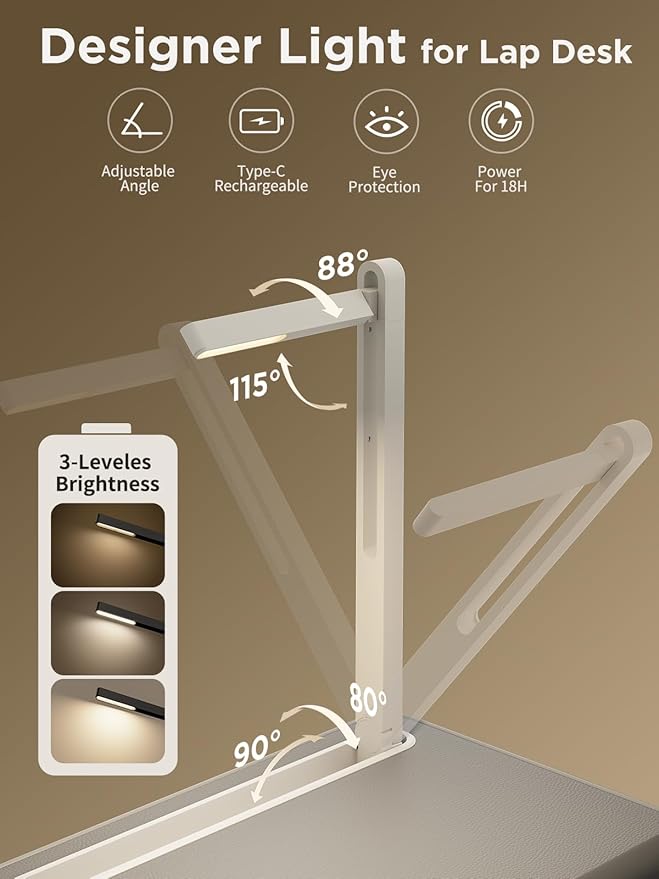 - Designer LED Light for Lap Desk: The LED desk lamp has three brightness adjustments to meet your different working, reading, writing, learning, entertainment, and other requirements. The adjustable light can be moved up and down and can also be rotated to provide you with a comfortable lighting environment and protect your eyes. The LED light can be easily removed from the laptop table and charged separately. College student essentials genion space lap desk with light