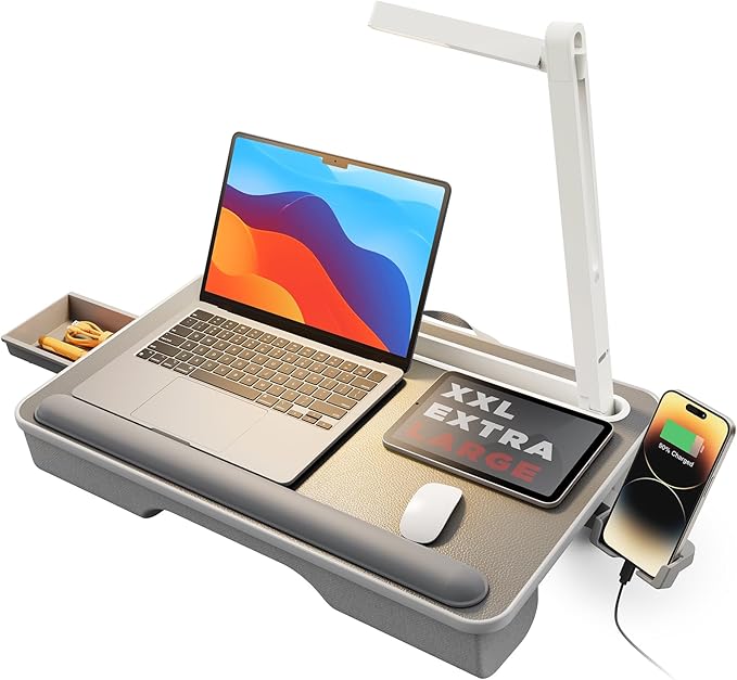 - Package: The lap desk is fully assembled, and the lamp's charging cable is placed inside the drawer of the desk.