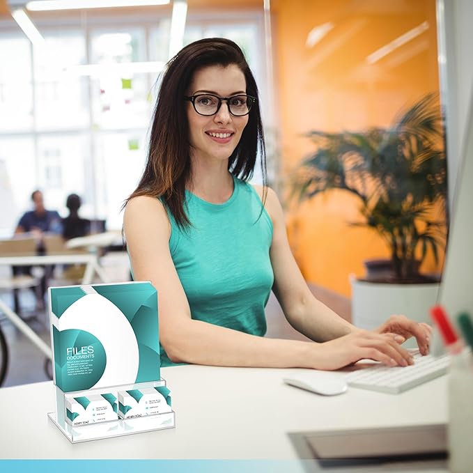 - OPTIMAL VISIBILITY AND BALANCED ANGLE Crystal clear design of business card and brochure holder keeps brochures and business cards fully visible for easy viewing. 83° angled design of pamphlet holder display stand offers optimal visibility to your materials.