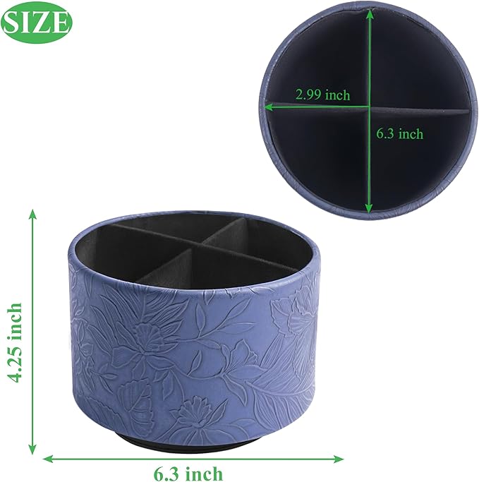Hennaja Round Leather Art Supply Organizer,Remote Control Holder,360 Degree Spinning,Multi-Functional Pencil Holder,4 Compartments Desktop Stationary Organizer(1-Carved Dark Blue)