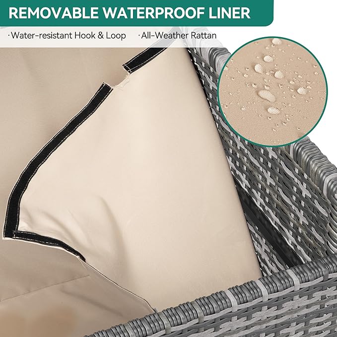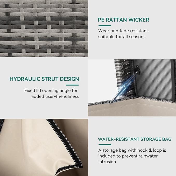 - All-weather Material- The powder-coated steel frame is covered in all-weather hand-woven wicker to achieve easy cleaning as well as great resistance to sun, rain, heat, cold, cracking, sagging or fading; Widened waterproof lid provides better storage protection; Front handle facilitates easy opening of this outdoor wicker storage.