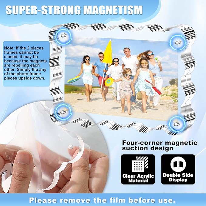 - Intuitive Magnetic Closure System The self-aligning neodymium magnets embedded in wave-edged panels deliver 8.5lb holding power—securely grips standard photo paper, laminated certificates, or textured cardstock in our acrylic magnetic picture frames without adhesive residue. Features foolproof polarity alignment: If magnetic scalloped picture frame panels resist closing, simply flip one acrylic block to activate instant snap-close mechanism.