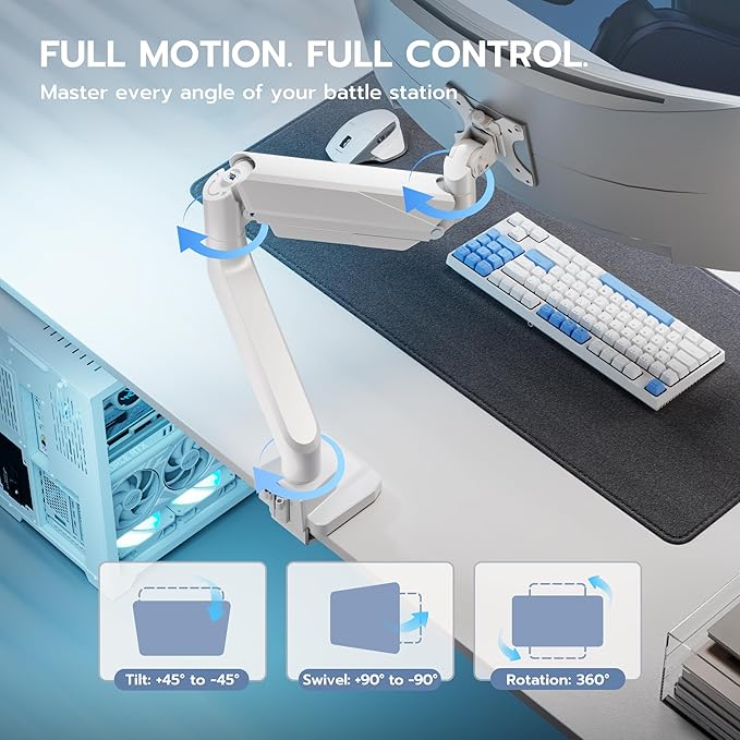 - Ergonomic Comfort & Full Motion - A monitor placed too high, too low, or at the wrong distance can lead to neck and shoulder pain over time. That’s why a monitor arm is more than just an accessory—it’s a game changer for your comfort and health. Unlike standard monitor stands, this fully adjustable arm gives you the flexibility to position your screen exactly where you need it for proper ergonomics.Enjoy effortless adjustments with a wide range of motion: tilt from +45° to -45°, swivel from +90° to -90°, and full 360° screen rotation. Whether you're working, gaming, or multitasking, you’ll always have the perfect viewing angle