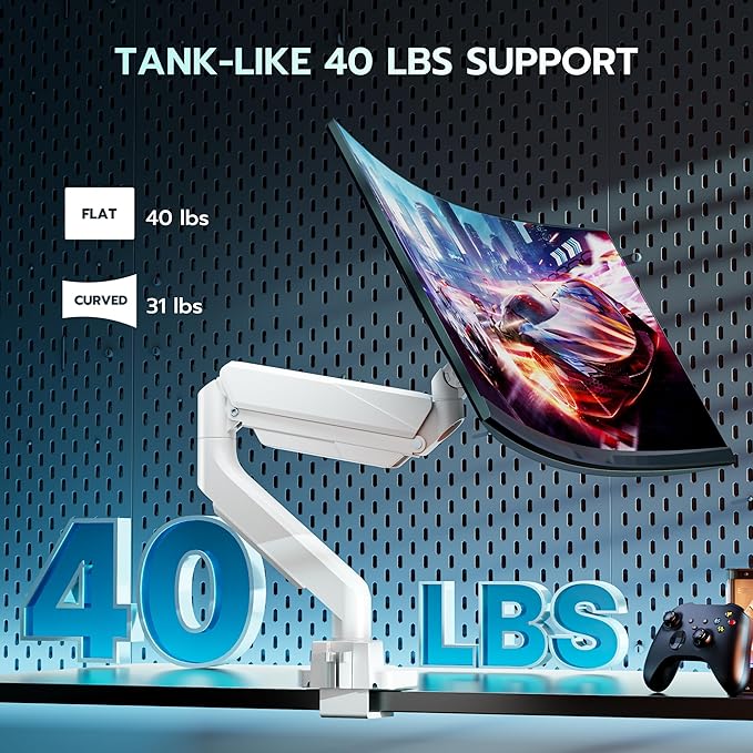 ARES WING Single Monitor Arm, Heavy Duty Adjustable Monitor Arm for 13"-45" Screens with USB, Gas Spring Desk Mount Stand with C Clamp/Grommet Mounting Base up to 40lbs Computer, White