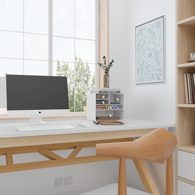 Desk Organizer Set, White & Clear Stackable Dustproof Storage Boxes for Desktop, Office, Bathroom, DIY Craft & Vertical Space Saving, Perfect for Makeup, Stationery Organization (5 Drawer)
