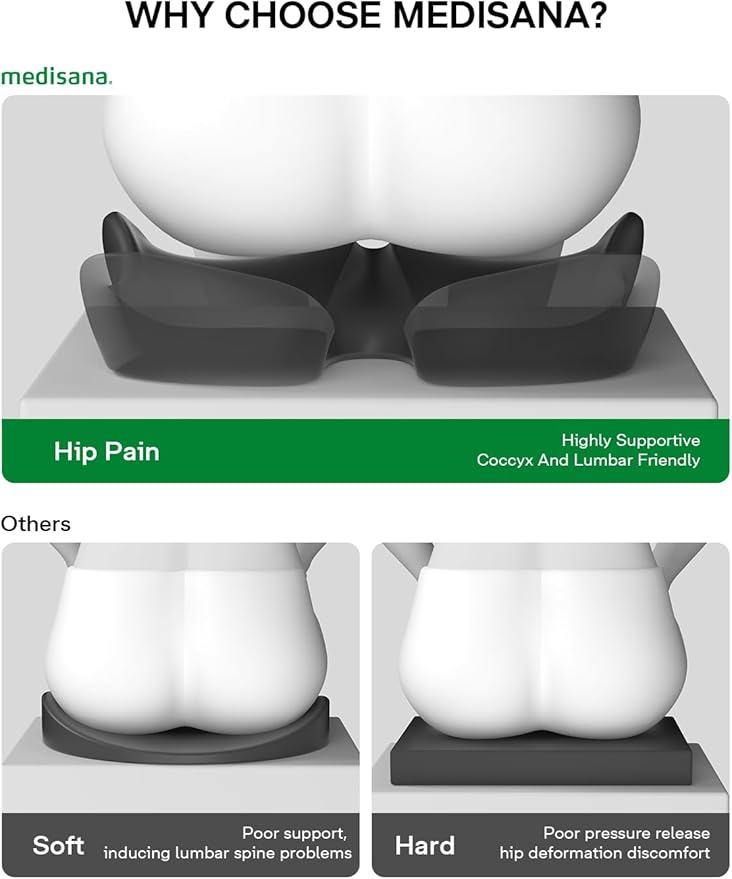 - 【Ergonomic Chair Cushion】medisana seat cushion is based on ergonomics, the legs, buttocks, tailbone, physiological zone for scientific design of the six zones, targeted decompression of legs, tailbone, left and right buttocks, physiological zone, soothing spine protection.Helps to improve sitting posture and effectively relieve lower back pain and hip discomfort