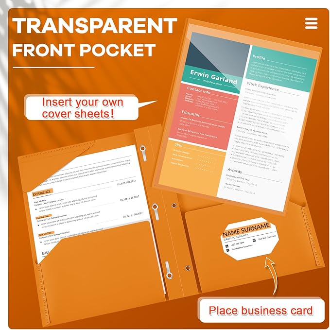- Practical and Useful: with a clear front pocket, you can put your catalog, tables, favorite reports, presentations and more for clear display; Each plastic folder has 2 internal pockets to help organize and store your letter sized paper and documents, there are also 3 prongs to secure your 3-hole loose leaf paper, and the card slot can hold your ID card or business card, practical for your daily work