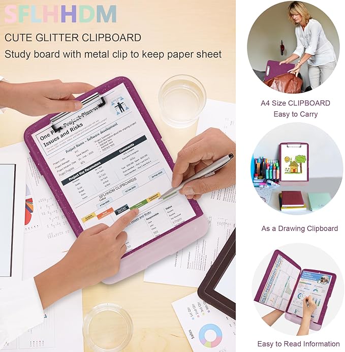 - Glitter Design: Clip boards 8.5x11 with storage have a bright color, Classic and chic glitter elements make this colorful clip boards more attractive. The ergonomic design of the grip is non-slip and comfortable. With this unique clipboard, your daily works are far more fun and easy