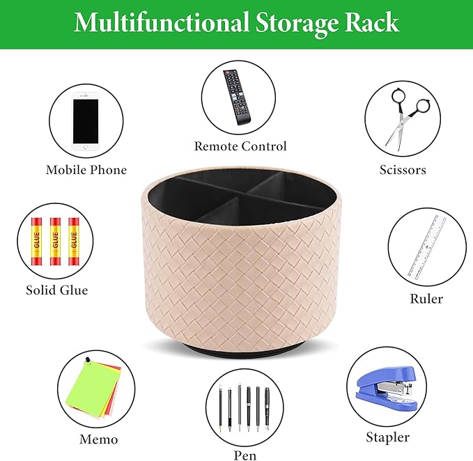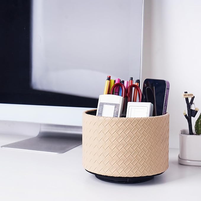 Hennaja Round Leather Art Supply Organizer,Remote Control Holder,360 Degree Spinning,Multi-Functional Pencil Holder,4 Compartments Desktop Stationary Organizer(1-Weave Khaki)