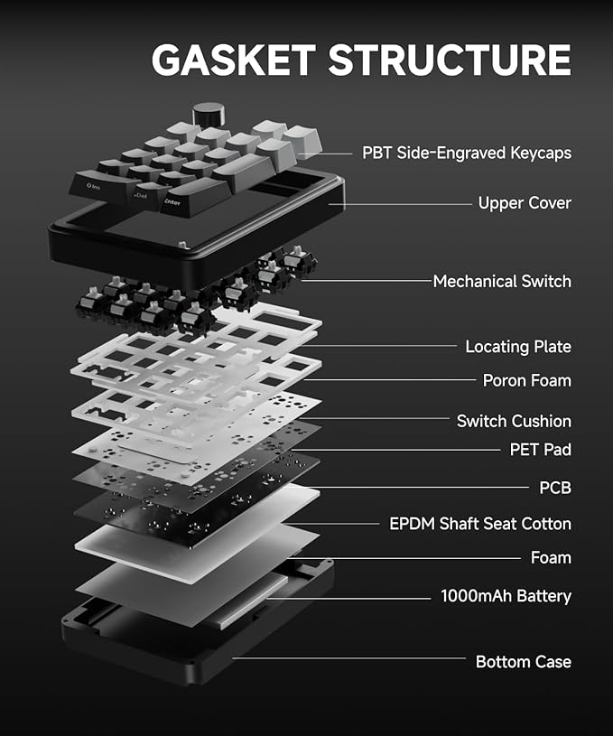 - 【Hot-Swappable Wireless Number Pad】: Mechanical numeric keypad uses a Gasket structure with multiple layers of soundproofing filling. Wireless numpad features a hot-swappable base, also includes three Baima Axis switches and a shaft puller, allowing you to replace 3 pins/5-pin Mechanical switches freely. Comes with Baima Axis switches, bringing you a comfortable and pleasant typing experience.