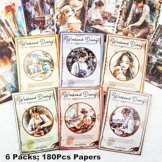 - Vintage-Themed Assortment: Features 6 aesthetic themes including café, sewing, reading, and art, each with 10 unique designs and 3 copies per design, totaling 180 sheets that enrich your scrapbook or journal with nostalgic charm