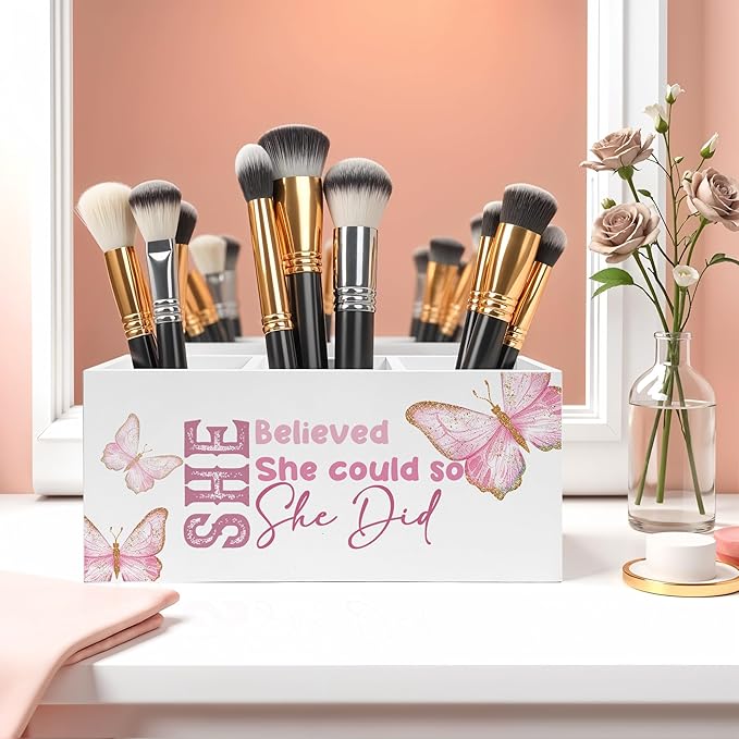 She Believed She Could Pencil Pen Holder for Desk, Inspirational Gifts for Women, Retro Coquette Butterfly Wooden Pencil Holder Organizer for Home Office Desk Accessories