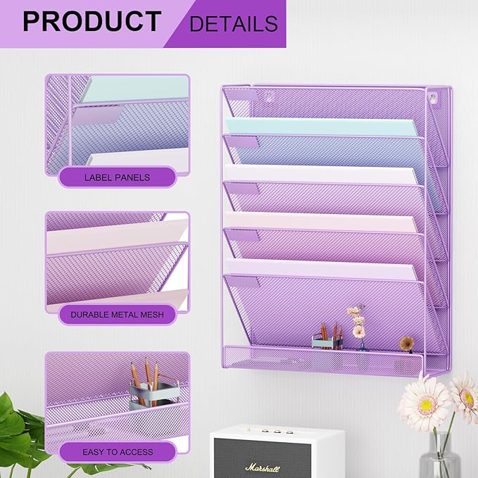 Wall File Organizer Holder Mesh Hanging Paper Document Holder, Vertical 6 Pocket Tier for Office Home, Light Purple