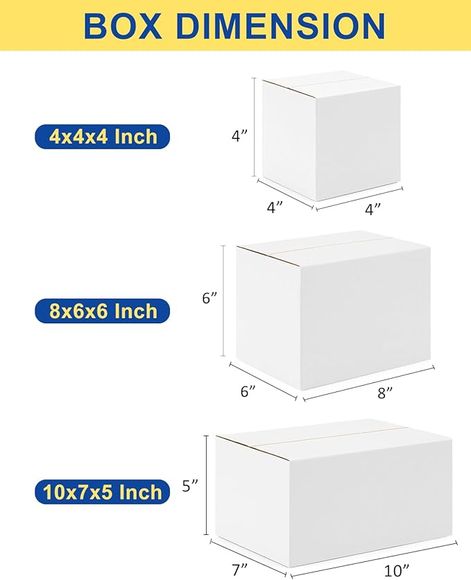 - Small Shipping Boxes 45 Pack: Each set includes 15 pcs of 4x4x4 inches, 15 pcs of 8x6x6 inches and 15 pcs of 10x7x5 inches white shipping boxes. Convenient quantity of 45 pack assorted sizes shipping boxes meets most shipping needs and packaging needs