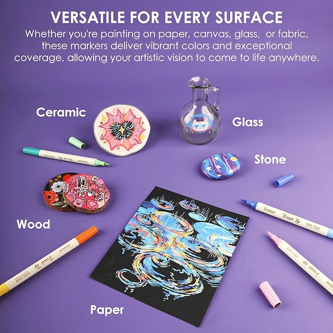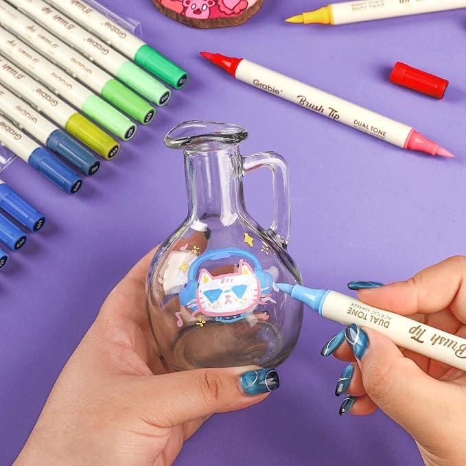 - Experience the versatility and vibrancy of the Grabie 2-in-1 acrylic marker Set. With dual-color brush tips, this innovative design offers a wide range of colors in one convenient set. Crafted with premium acrylic paint, these markers are non-toxic, quick-drying, and perfect for any surface. Whether on paper, stone, glass, or beyond, Grabie markers deliver bold, vivid colors and superior performance with every stroke