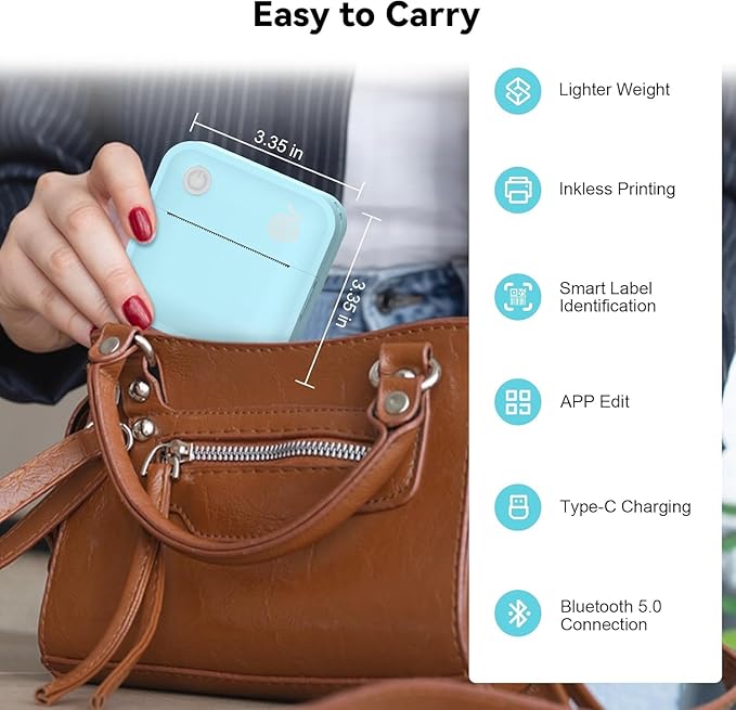- Pocket-Sized and Ultra-Light: Our sticker printer is only 3.15in x 3.15in (50% of the size of an Smart Phone) and weighs 140g! With wireless Bluetooth 5.0 connection, you can put it in your pocket or backpack and print all kinds of labels and stickers anytime, anywhere.