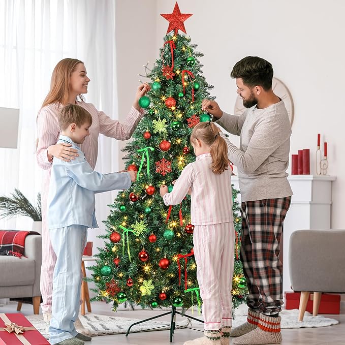 86Pcs Led Light Red and Green Christmas Tree Decorations Set 100 Led Light Christmas Star Trees Topper with String Lights Xmas Balls Snowflakes Ornaments Bows Xmas Trees Decor 20m Light String