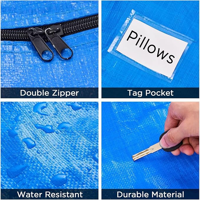 - CLEAR TAG POCKET & WATERPROOF - Our moving bags are equipped with side opening clear tag pocket for easy identification of items. Please don't forget to use this labeling feature when organizing college essentials, moving to a new home or storing garage items. Tote bag are 100% PE to protect items from rain, snow or accidental spills during the moving process. 1/2 double zippers with wide opening allow for easy access to items.(Zipper seams aren't waterproof !!!!!)