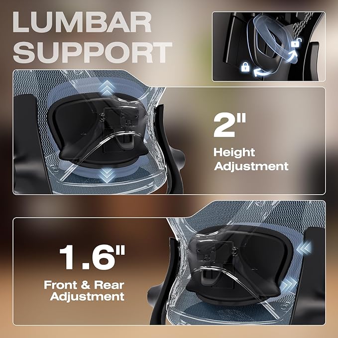 - 【Engineered with Dynamic Spinal Alignment System】3D Synchro-Tilt Lumbar(Lockable ±1.6" depth spring-loaded auto-tracking/±2" height/15° rotation)with force-sensitive springs mimics natural spine curvature, certified by AEP* for 12hrs+ fatigue reduction in ergonomic chairs (*American Ergonomics Partnership)