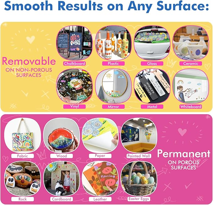 - PLEASE NOTE:Our erasable chalkboard markers work perfectly with bright and vivid colors on ALL non-porous surfaces. it's recommended to try them first on small areas and always follow the cleaning instructions provided.NOT ALL CHALKBOARDS ARE SUITABLE FOR THE USE OF CHALK MARKERS. PLEASE TRY THE MARKERS ON SMALL AREAS FIRST TO AVOID RUINING YOUR BOARD.