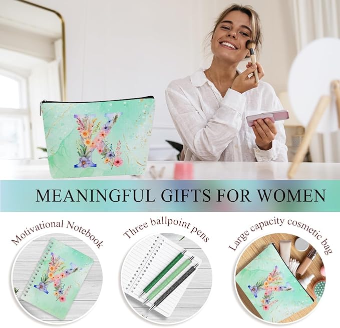 - Sufficient Quantity Personalized Gifts:This 6-pieces Letter surprise gift perfectly combines practicality and cuteness, making it an excellent choice to convey your heartfelt feelings! Our monogrammed gifts for women set contains a range of items; you will receive 1 x 20oz Tumbler with lid, 1x Notebook, 3 x push-on Glitter Ballpoint Pens, and 1 x Cosmetic Bag; the set is large enough to meet your gift needs.