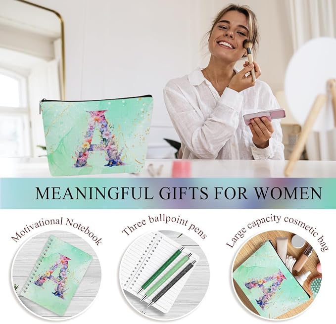 - Sufficient Quantity Personalized Gifts:This 6-pieces Letter surprise gift perfectly combines practicality and cuteness, making it an excellent choice to convey your heartfelt feelings! Our monogrammed gifts for women set contains a range of items; you will receive 1 x 20oz Tumbler with lid, 1x Notebook, 3 x push-on Glitter Ballpoint Pens, and 1 x Cosmetic Bag; the set is large enough to meet your gift needs.