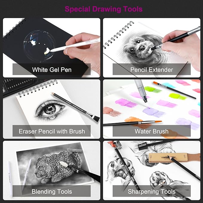 - Essential Drawing Tools: This versatile art set also includes almost all the accessories for sketching and drawing,includes 3 blending stumps,1 sketch wipe scraper,10 replacement heads,1 white gel pen,1 water brush pen,1 brush,1 vinyl eraser,1 kneaded eraser,1 sandpaper block,1 plastic sharpener,1 metal sharpener,1 art knife,1 pencil extender.These extras are essential for artists and beginners.