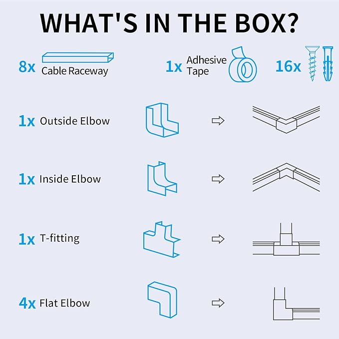 - 8pcs cable management kit: Each TV cable hider comes with 8 cable channels, ensuring a total length of 113.6 in, for any residential or office project. This cable hider kit also includes some parts, reliable mounting tape for maximum cord concealment