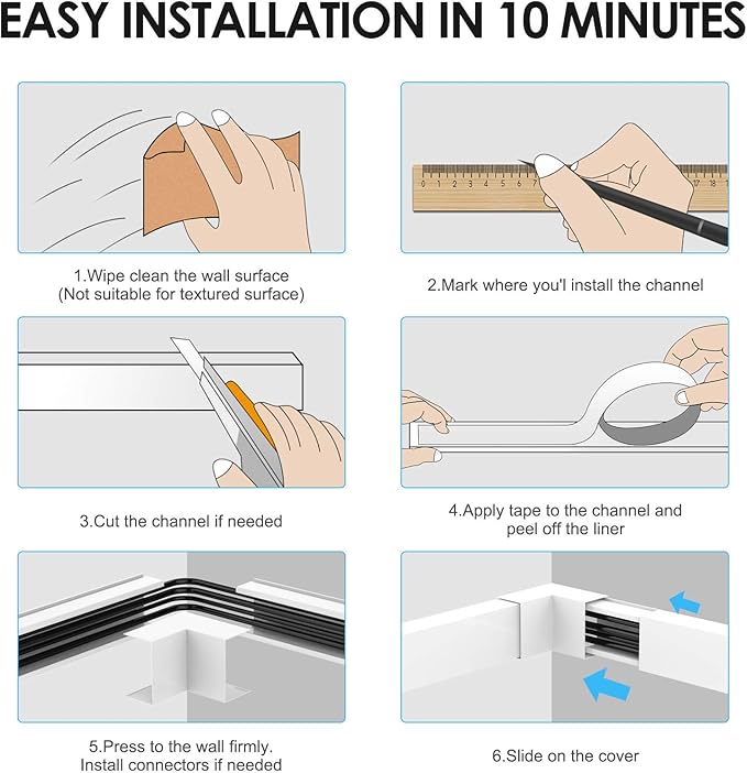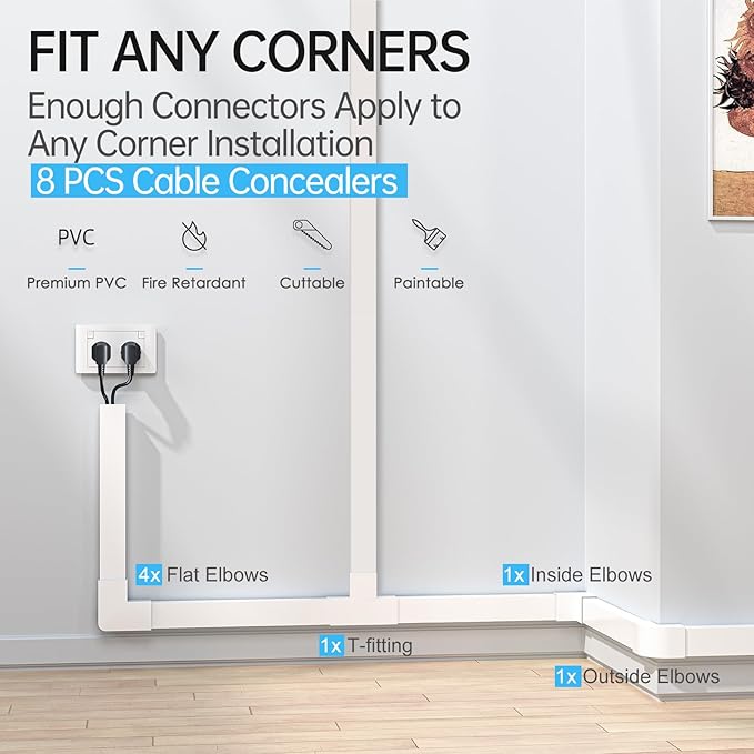 - 8pcs cable management kit: Each TV cable hider comes with 8 cable channels, ensuring a total length of 113.6 in, for any residential or office project. This cable hider kit also includes some parts, reliable mounting tape for maximum cord concealment